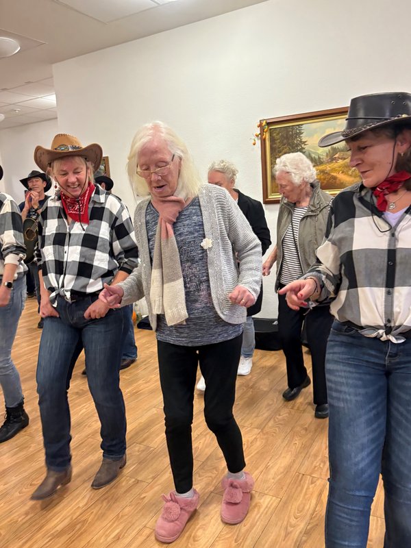 Ein weiteres Highlight des Nachmittags war der Auftritt einer Line-Dance-Gruppe, die mit schwungvollen Tänzen echtes Western-Feeling in den Saal brachte. Besonders schön: Die Tänzerinnen luden die Bewohnerinnen und Bewohner zu einem Mitmachtanz ein – und viele ließen sich nicht zweimal bitten! Bald bewegten sich Alt und Jung gemeinsam im Takt der Musik über das Parkett.