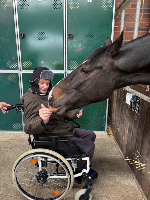 Mit viel Neugier und Begeisterung erkundeten die Senioren die weitläufige Reithalle und die gepflegten Stallungen. Dabei gab es einiges zu entdecken: vom leisen Schnauben der Pferde über das Rascheln des Strohs bis hin zum gemütlichen Klappern der Hufe. Die Tiere ließen sich geduldig streicheln und freuten sich sichtlich über die mitgebrachten Leckereien – knackige Möhren, die liebevoll verteilt wurden.