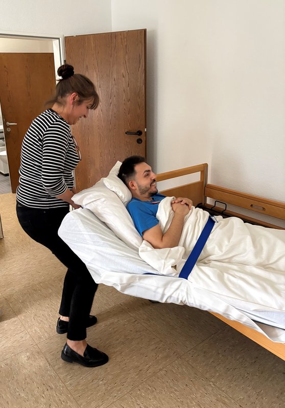 Mit Hilfe eines speziellen Rettungstuchs üben die Mitarbeitenden die Evakuierung von bettlägerigen Bewohner:innen. Jeder Teilnehmer/ jede Teilnehmerin erprobt die Rettung als rettende sowie als zu rettende Person, um einen ganzheitlichen Eindruck und Handlungssicherheit zu erlangen. Für den Fall eines Entstehungsbrandes erhalten die Teilnehmenden eine Einweisung in den sicheren Umgang mit Schaum- und Pulverlöschern und löschen hierzu einen streng beaufsichtigen Testbrand auf dem Außengelände.